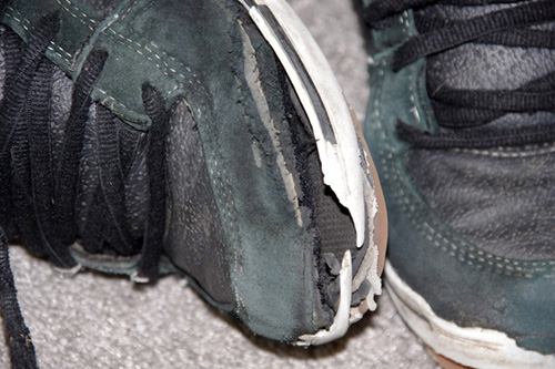 Duct tape works, at least in the short term of course, but it seems to me that you were on the right track with the inexpensive shoes. You switched to the pricier shoes for a good reason, an attempt to prove a hypothesis…but that theory was miss-proven…your son’s destructiveness to shoes trumps quality of footwear…in which case, I think, it is time to return to cheap shoes.
