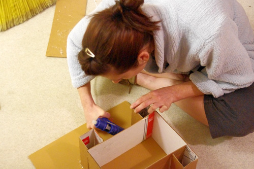 Wearing my Mission Making Uniform, hot gluing the building together.  I do believe this was the worst part of the whole project.  And damn, do I look HOT doing it!