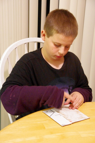 I did do most of the cutting with the Exacto knife, as well as much of the gluing of the building part to ensure a sound structure, for safety reasons, and because that anal side of me isn’t just going to disappear.  But he did the rest of the Mission, and did a fantastic job at it.