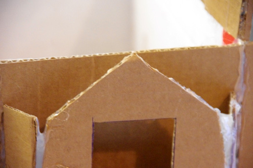 …the measurments may have been kind of screwy.  This part was supposed to be taller than the building.  And as you can see by the sides, we had to overcompensate with the glue in portions where the cardboard wouldn’t meet up.  We thought we had screwed up the whole thing.  But after painting it, adding the roof, and then decorating it with embellishments…..