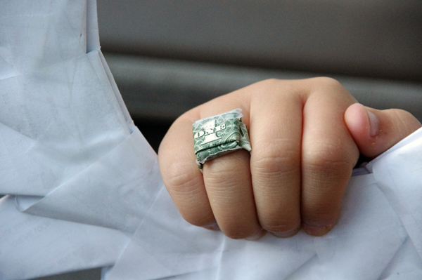 Yes, that is a dollar bill ring. Yes, I think my son is brilliant.