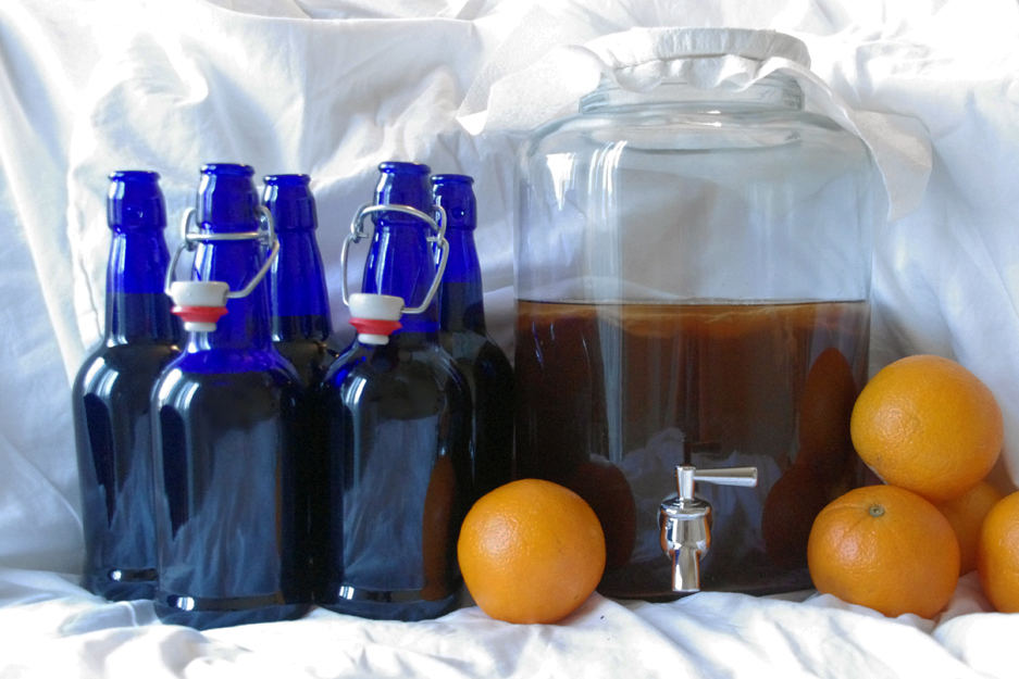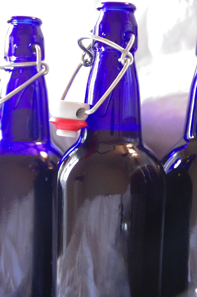 C. After 7 days, taste-test a small portion. It should have a slightly sour taste with a bit of effervescence. If it still tastes sweet and flat, let it sit for another day. Repeat every day until it’s achieved the desired fermented state. Bottle the kombucha by placing it in separate airtight bottles (I found some beautiful blue bottles with swing top caps at The Beverage People at 840 Piner Rd #14, Santa Rosa), or in a large airtight container. Notice the theme: airtight. This allows bubbles to build up in the tea. Once bottled, you can start the brewing process all over again, adding a cup of reserved kombucha from this batch and repeating the directions to create the sweetened tea for brewing.