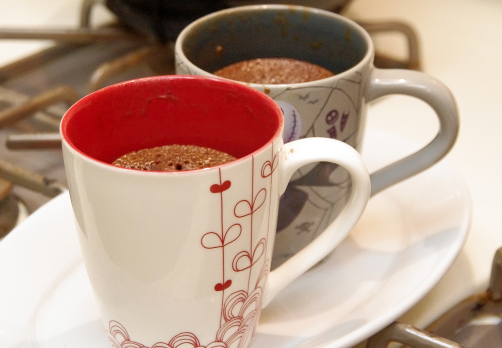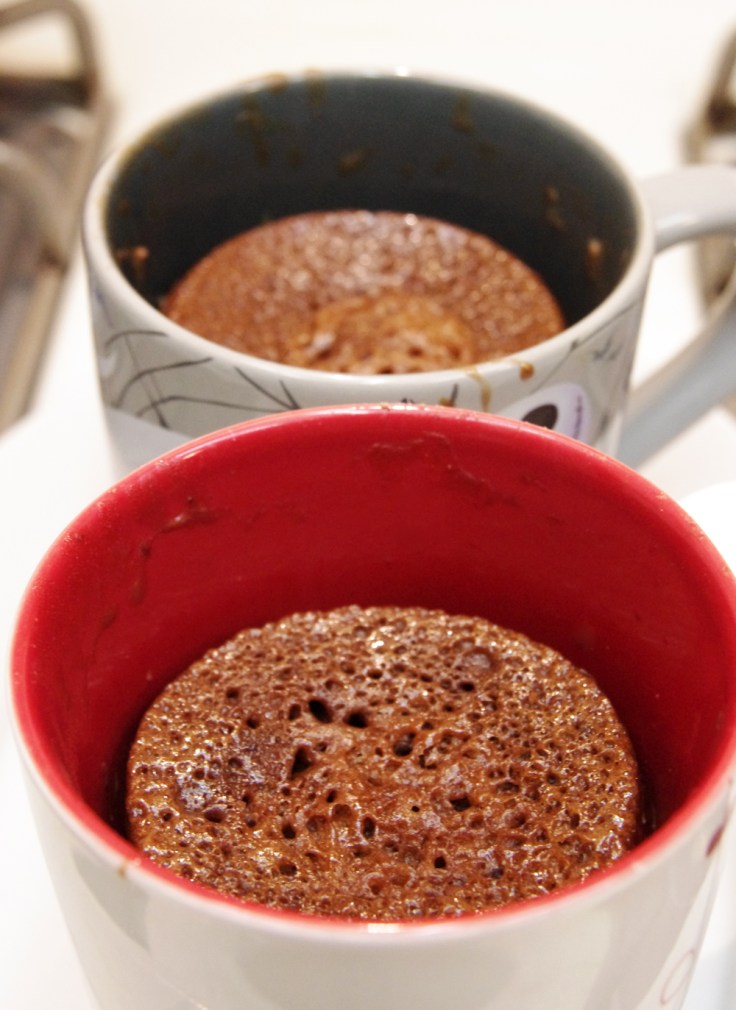 However, I did remember coming across a recipe for a single cup of chocolate cake that could be made in the microwave. This seemed like a worthy challenge to undertake, so I set to perusing the world wide web of Google and came across a promising one. The result was about 3 minutes of mixing and 2 minutes of microwaving to come up with a spongy version of moist cake. It wasn’t like a traditional piece of cake, but it put to rest the Mr’s chocolate craving. And he may have been slightly impressed by my “baking” skills, being that I had this in front of him within 5 minutes.