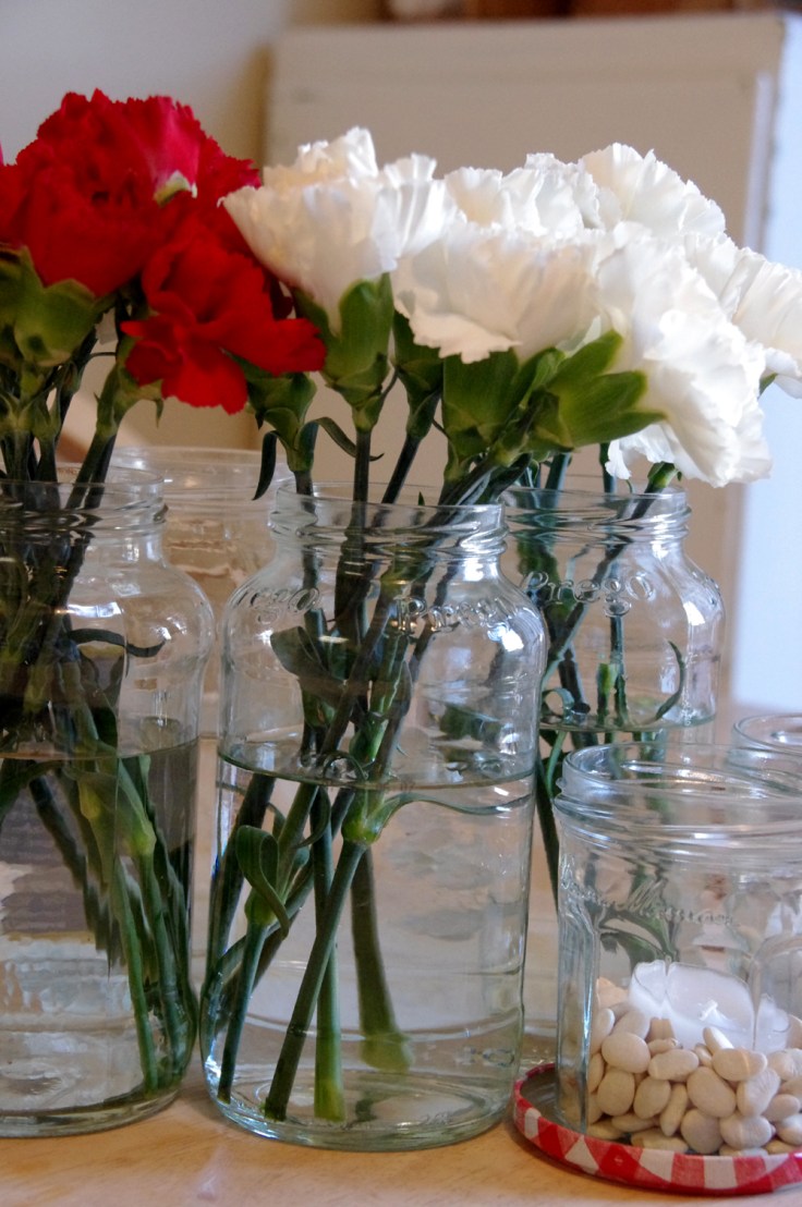 I put these together last night and had them on the table when we all sat down to eat for dinner. My stepson took one look at them and mentioned how pretty they were. And they are. The stems cost me 50 cents each from Safeway, and would probably be half that price if I had bought them from Costco. And I don’t necessarily have to stick to just carnations, but they do make a surprisingly lovely way to pop in some color while staying my theme.