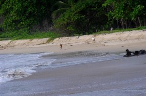 The brown one reached us first, running around us before planting himself next to my leg. I carefully placed my hand near his nose, praying silently to him not to bite me. He didn’t. Instead he licked my hand. He was young with a happy smile on his face, full of energy as he ran back and forth between us and the waves.