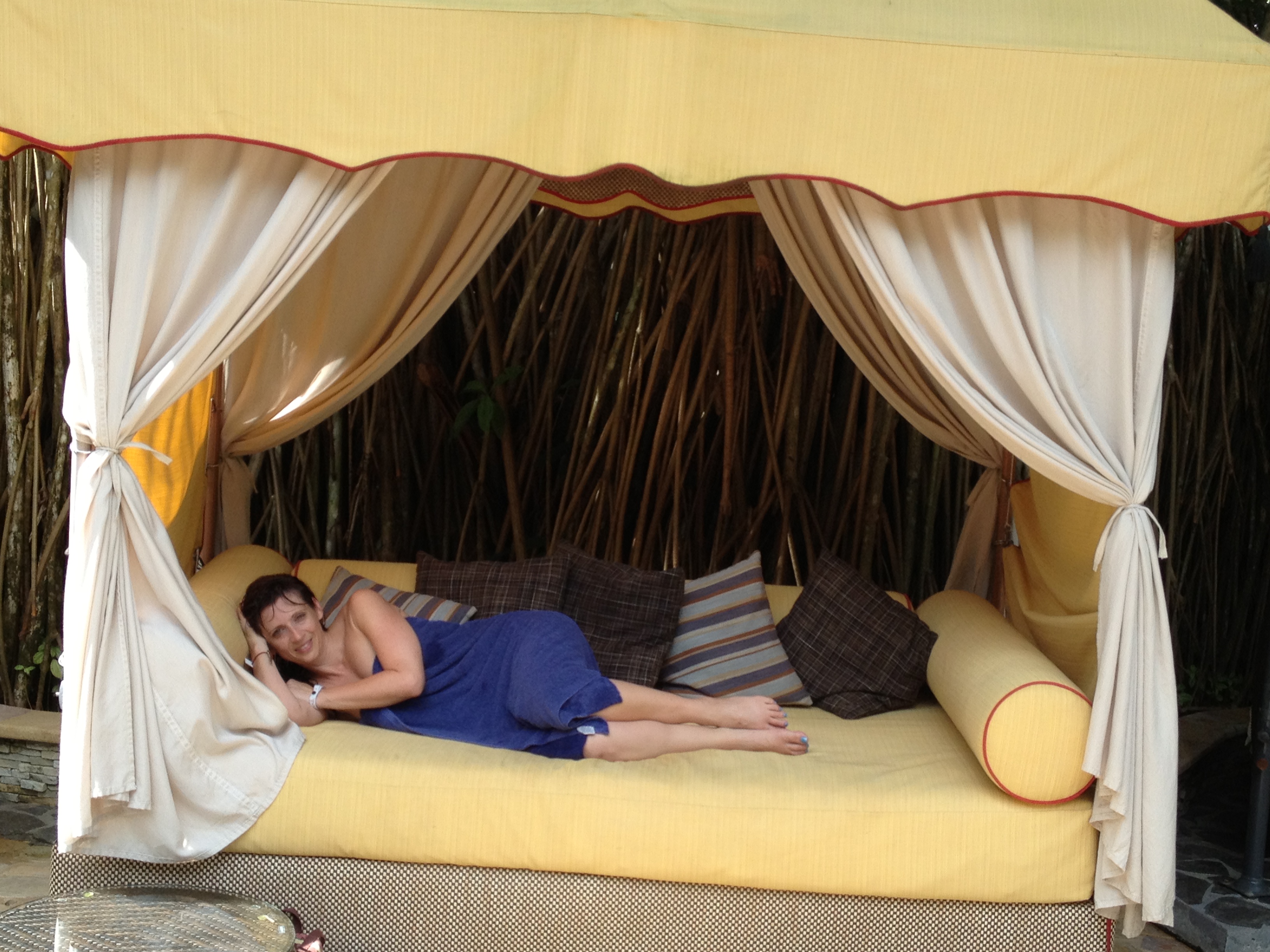 We took a break from the heat by retreating to the rest area at the top of the resort. Several lounges with curtains were there, meant for an afternoon siesta in between soaks. We claimed one as our own, pulling the curtains closed and laying next each other in our little fort. Shawn’s breath became slow and heavy, and I fell asleep soon after. We probably only slept for 10 minutes, but it was just enough to refresh us. We considered allowing this to be our ending moment and just head home, but the pools seemed so inviting. We visited a few more, taking advantage of ones with rushing waterfalls that worked out the kinks in our backs and the deeper pools that allowed is to float while memorizing the canopy overhead. Throughout our adventure we took turns snapping photos, ensuring the memories would stay longer.