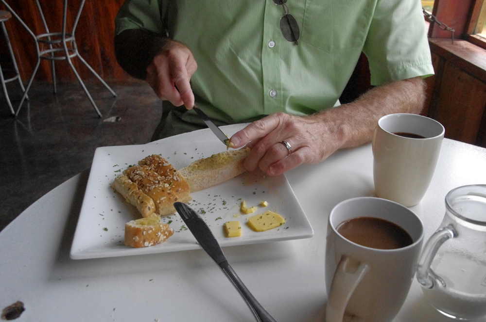 Today, our day started with a continuous sheet of rain. I woke at 5:30 with the air stale because the AC had stopped. The electricity was out. I quietly got dressed and went outside to watch the rain, soon joined by Shawn. The door had woken him up. We dressed and went down for breakfast before hitting the road. Our biggest plan for the day was to hit the spa at Tabacon, a posh resort 3-4 hours away. We also hoped to get in a few other adventures like a walk on a 2-mile bridge across the rainforest and some zip lining. That proved to be overly ambitious however.