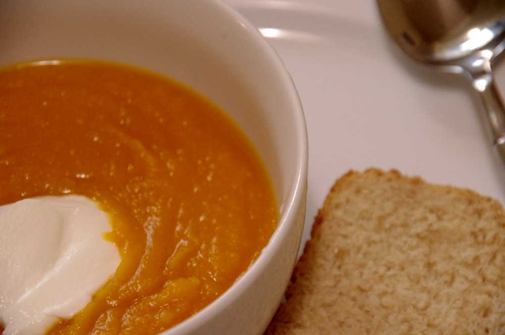 The soup is not my own recipe, so I’ll link to it from here. It’s by Hank Shaw who blogs over at honest-food.net all of his food adventures that include hunting, gathering, angling, and cooking. It’s like the manliest food blog you could come across. He also just came out with a pretty kickass cookbook with all the recipes he’s blogged about along with some pretty snazzy photos. He always comes up with something droolworthy that has me wishing I could be close enough to smell his kitchen, maybe even taste a few dishes. So when he posted a Squash Soup recipe on his blog that called for bacon to give it a bit of fatty pizazz, I was sold.