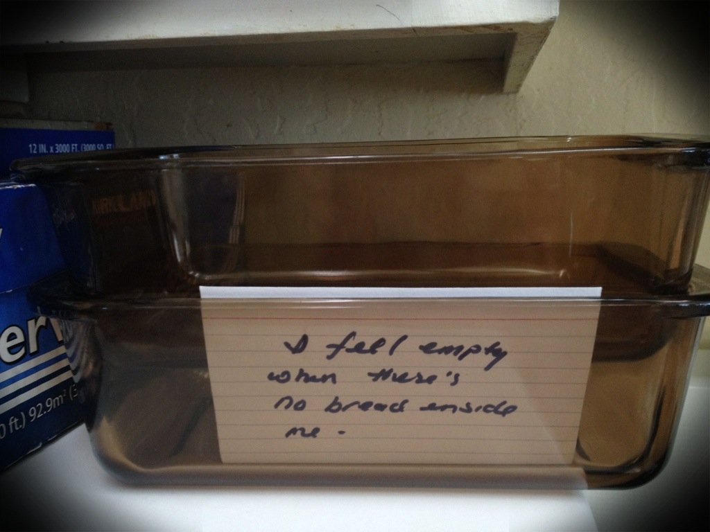 When I got home, however, apparently the loaf pans and my husband had a heart to heart while I was gone. My husband heard I had made banana bread while he was away on a business trip, and none was saved for him. The loaf pan felt bad about this, and felt the need to share its own feelings: